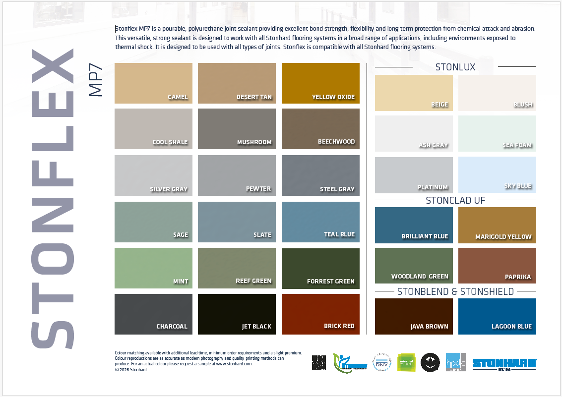 Stonhard erbjuder en bred palett av standardfärger från rena, svala blåa och gråa färgtoner till varma, jordnära färger till djärvt röda och texturerade kombinationer för att väcka inspiration i industriella och kommersiella utrymmen. Matt, glänsande, tweed och solida ytor också. Fråga oss om vårt exklusiva färgutbud, skräddarsydda blandningar och personliga logotyper.